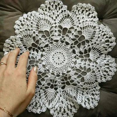 Вязала ее по МК с ЮТУБа, процессом и результатом очень довольна. Освоила "ананасы", очень они мне понравились. Да, тонкие ниточки, да, лучше бы смотреть с более толстой пряжей, но имеем, что имеем. Оскому немного сбила этими салфеточками, можно думать и мечтать о чем-то другом.