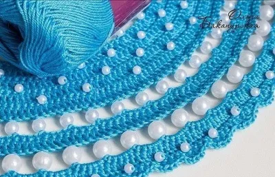 2. У меня это будет круглая кокетка для платья. В начальные ряды я ввязывала бусины обычным способом, предварительно нанизав их на нитку. А вот так выглядит ряд, в котором будет дорожка из бусин.3. Это может быть ряд из СН или, как у меня, из СБН. В начале ряда делаем несколько воздушных петель (в. п.) подъема – по высоте бусины. Дальше вяжем СБН несколько петель (по диаметру бусины). У меня довольно крупные бусы, поэтому я вязала 3 столбика. Провязав 4-й столбик, вытягиваем петлю на крючке так, чтобы по длине она соответствовала бусине.