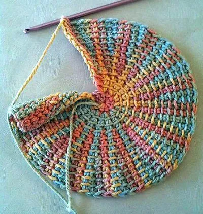 В основном круге 10 столбиков с накидом, а раппортов по кругу 20, т.е. в каждую вершину столбика цеплять по 2 "раппорта". После чего следует оставить длинную нить и ею же сшить края.