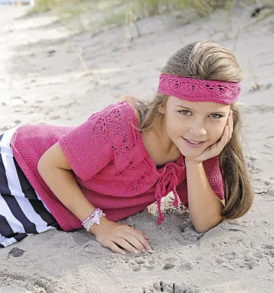 Очаровательный джемпер для девочки с широким вырезом, присобранным по кокетке на шнурок, можно дополнить ажурной налобной повязкой.