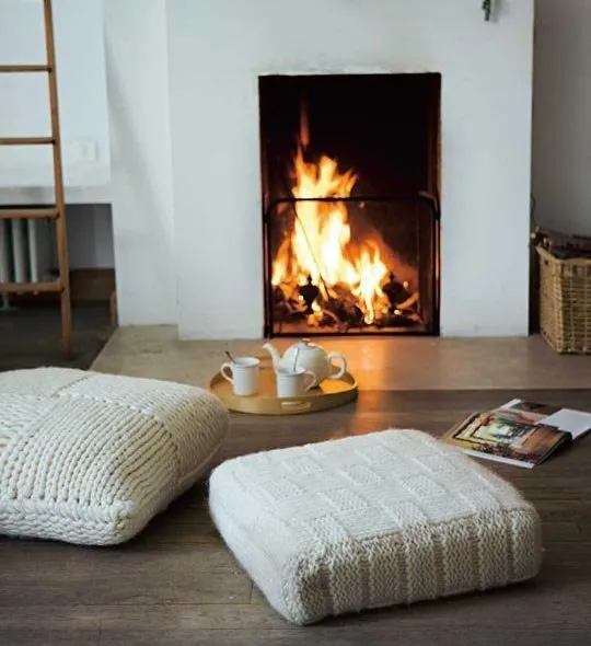 Напольные подушки в вязаных наволочках с декоративным узором «шахматная доска» придутся кстати и в гостиной, и у камина.