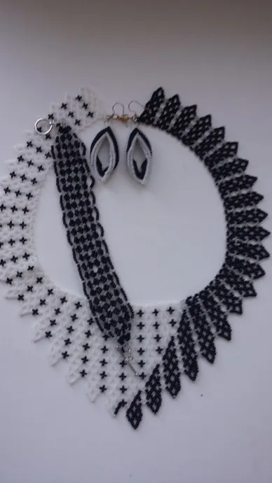 комплект выполнен из чешского бисера черного и белого цвета. Белый символ добра,а черный символ зла. Так как черного здесь больше то название День и Ночь я думаю подходит больше. В интернете можно встретить оба названия. Я решила сделать комплект. Делала для двух девушек, по этому браслеты разные, а колье одинаковые.