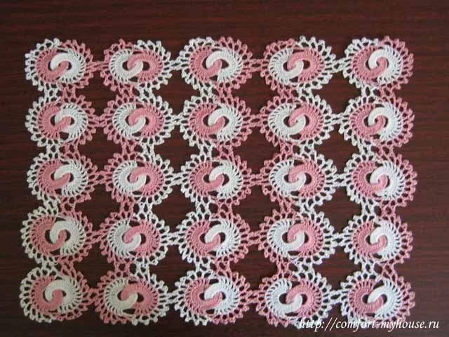 Для своей салфетки я использовала белую и розовую пряжу Ирис и крючок №1.