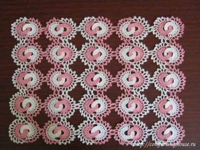 Последнюю петлю белого колечка я соединила с розовым, а розового с белым. Хотя на схеме это соединение не было показано. Но я решила, что так получается более законченный вид мотива.