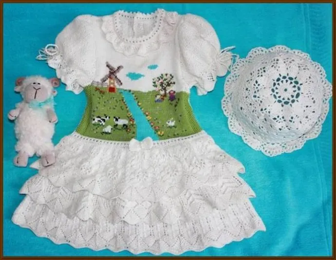 Давно увидела это платье в интернете и просто"заболела" им...Вязала для Миланочки на 2,5-3 годика. Потом случайно наткнулась на него в Стране мам - Платье спицами "RL forever",затем там перешла по ссылке на"Осинку"- Ассорти из оборок - платья от RL спицами,перерыла там всю тему,нашла подходящие схемки. Вязала из пряжи "Нарцисс-. 100% мерсеризированный хлопок в 100г 395 м,спицы 2 мм.Ориентировалась на описание Герцогини ,но пришлось все пересчитывать на себя,т.к. никак не вписывалась в размер,хотя дети одного возраста и судя по ее фотками девочки примерно одного телосложения,но у меня закрались сомнения ,что она вязала верх платья в две ниточки,а я в одну....Рукавчики сделала по-своему,оборки для рукавчиков и ворота тоже нашла в интернете сама подходящие.С рукавами намучилась,но все-же я их победила....У Герцогини нет планки для застежки на спине,а я решила сделать...и бантика нет,и заязочек на рукаве,линия перехода переда в оборки и ворот у меня тоже чуть другие...... вобщем,что получилось,то получилось...Мелкие детальки вышивала   мулине ( подруга занимается вышивкой и поделилась разными ниточками...))) Платье встраданое,но результатом я довольна.