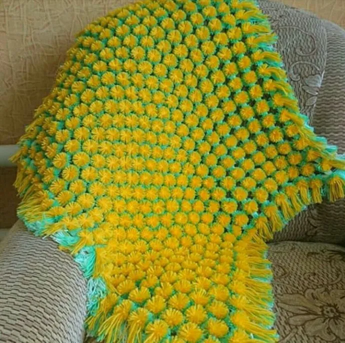 Девочки-мастерицы, всем добрый день! Нашла в Интернете вот такой чудесный яркий одуванчиковый плед. Его автор lesy879 мне кажется, использовала ковровую технику, или это помпоны? Есть идеи касательно сочных одуванов?