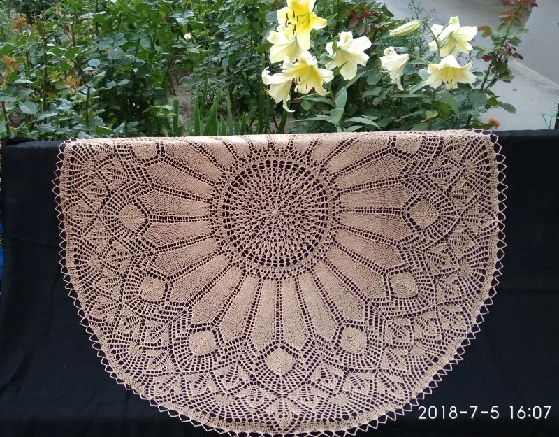 Скатерть тоже начинается 24-я повторами, а в кайме их 12, но в ней точный расчёт, всё хорошо заблокировалось, и форма получилась правильной.