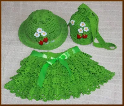 Вязала опять для Миланы- на 2,5 годика. Комплект с клубничками состоит из юбочки,сумочки и шляпки.Связано из пряжи от Vita Сосо-100% хлопок в 50 г 240м.Крючок 1,5 мм. К нему связались еще два топа.Один совсем простенький салатового цвета с ромашками связан из пряжи MISS от Alize -100% хлопок в 50 г 280 м. Крючок 1,25 мм.Второй связан по описанию знаменитой туники"Скарлет"от Аллы Коваль.Связан из пряжи от Vita Сосо-100% хлопок в 50 г 240м. Крючок 1,5 мм