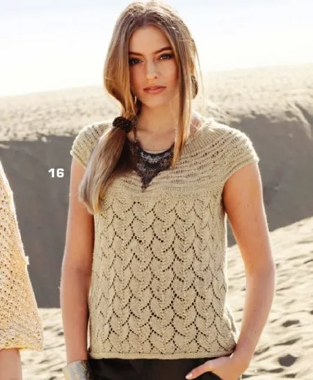 Летний топ связан с интересной круглой кокеткой, которую продолжает красивый узор ажурных листьев. Для вязания летнего топа выбрана пряжа из вискозы и льна, чтобы связанную вещь было комфортно носить в жару.