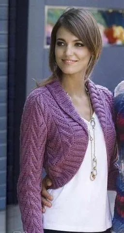 Рукав: Набрать 42 петли и провязать 5,5 см. резинкой 2×2, после чего продолжить вязание ажурным узором. Вязать, прибавляя с каждого края полотна по 1 петле в каждом 10-м ряду до тех пор, пока на спицах не наберется 58 петель. На высоте 40,5 см. с каждого края убавить по 3, 2 и 2 петли. Продолжить вязание, убавляя по 1 петле, до тех пор, пока высота части полотна с убавлениями не составит 10 см. Провязать оставшиеся петли еще 8 см. и закрыть их. Выполнить плечевые швы, втачать рукава в проймы и выполнить боковые швы. Набрать на спицу петли вдоль краев передних полочек и выреза горловины и провязать 6 см. резинкой 2×2. Затем с каждого нижнего края полочек закрыть по 14 петель. Продолжить вязание воротника, убавляя с каждого края 5 раз по 2 петли в каждом ряду. Когда общая высота воротника составит 13 см., закрыть оставшиеся петли.