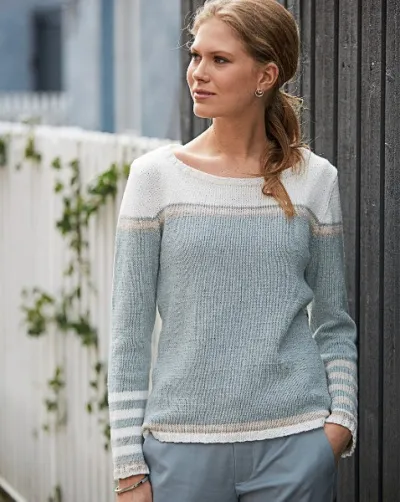 2 р. бежевых, * 6 р. голубых, 6 р. белых *, повторять от * до * , пока всего не будет выполнено не менее 8 полос, закончить белой полосой, продолжить вязать голубой нитью.
