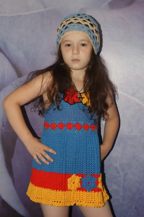 Здравствовать желаю всем! Ваши добрые слова пробудили желание делиться своими работами и идеями. Моя идея всем известна - если что-то стало маловато - надо удлинить. Главное, чтобы не испортить изделие, потому что обычно уже пряжи нужной нет, приходится измудряться. Моя внучка-деточка носит мои вязалки активно, за что ей спасибо и поцелуй. Еще в детский сад связала ей платье - сарафанчик. Ниточки удачные, правда не тонкие кажется джинс 100% хлопок. Вязать приятно, ниточка сама в петельки прыгает, носить комфортно, иначе деточка бы не стала так его эксплуатировать, ибо привередлива. По мере роста надвязала уже 2 "этажа". Остатки ниточек - в дело ушли, ребенок доволен, и я тоже - моя работа не на помойку сделана. Не бойтесь экспериментов, добавляем в работу поиск и творчество. Последний этаж вязала узором, с которым одно удовольствие испытала, называется узор "объемные цветы"
