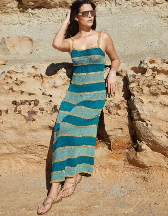 Чередование полос цвета морской волны и золота придает платью макси на бретелях невероятный шик! Оно достойно восхищения и с легкостью войдет в число топ-моделей вашего летнего гардероба.