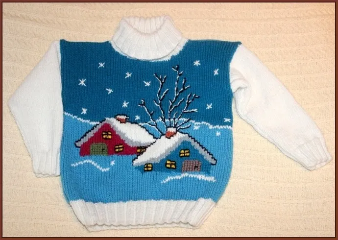 Увидела картинку из журнала в интернете-свитерок и кофточка с очаровательными домиками и сразу загорелась связать...Сначала связала для Миланы...Пряжа LANAGOLD 49% шерсть 51% акрил, 240 м, 100 гр. Спицы 4мм и 4,5 мм. Сын сфоткал на телефон Миланочку в этом свитерочке,показал друзьям....Пришлось вязать еще один для из пятилетней дочки ,только уже из других ниточек -SUPER EXCELLENCE 49% шерсть, 51% акрил, 228 м, 100 гр. от MAGIK(Турция)спицами 3 и 3,5 мм.