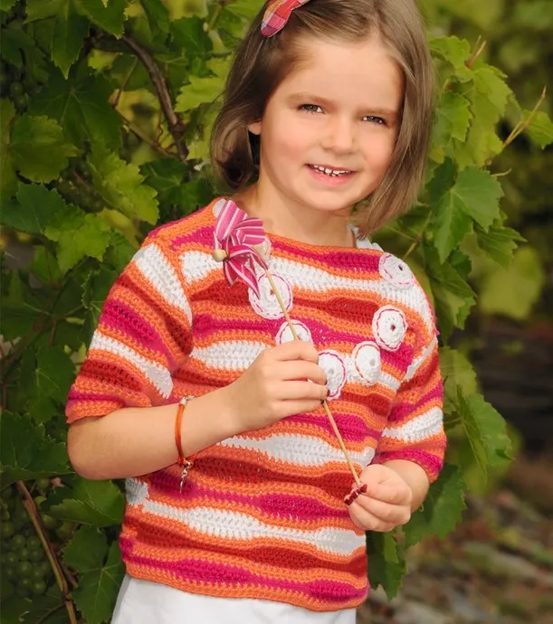 Белой нитью связать 7 кружков. Кружки распределить по переду согласно фото и пришить отдельными стежками красной, лососевой нитью и нитью цв. фуксии.