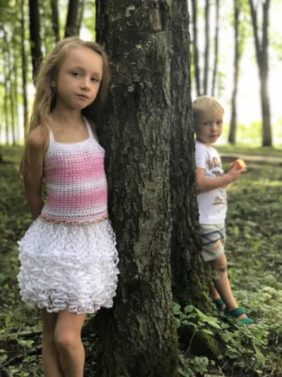 Когда юбка была готова, то обвязав край, надвязала уже топ крючком.