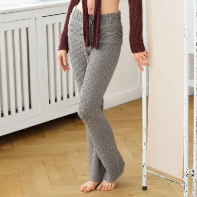 Посадка вязаных брюк оптимальна и безупречна благодаря идеально выверенной форме брючин и ластовицы, связанной поперек кокетке с «косами» и поясу-резинке с регулируемой шириной.