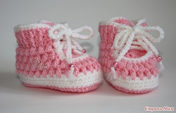 Для работы понадобятся: - крючок №2,5, - пряжа полушерсть, либо хлопок двух цветов, - атласные ленточки для шнурков. Размер: 0-3 мес. Вяжем подошву по схеме. Подошву обвязываем ст. б/накида, вводя к...
