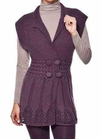 Не знаю как вы, а я обожаю туники - они всегда смотрятся красиво и уместно. Эта ажурная туника в красивом фиолетовом цвете связана спицами из полушерстяной пряжи двумя фантазийными узорами и стягивающим узором с косой на линии талии.