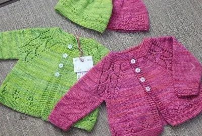 Повторять последние 2 ряда пока на спицах не останется 83 пет., выполняя ряд с дырочкой для пуговки каждые 10 рядов.