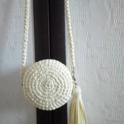 Круглая сумочка из трикотажной пряжи,нежнейшего цвета экрю , диаметр 15 см, глубина 8см. На очень удобной мягкой вязаной ручке-не давит на плечо. Красавица!