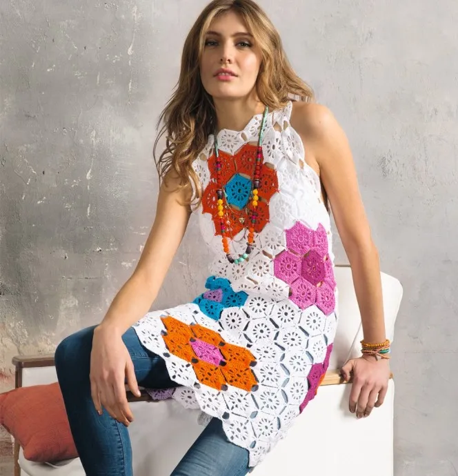 На белоснежном фоне распускаются огромные яркие цветы. Мозаика из множества маленьких шестиугольников складывается в очаровательное мини-платье.