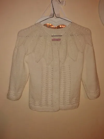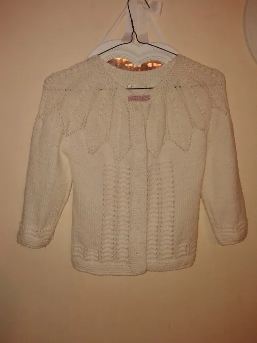 года 4 назад связала вот такую кофточку по образцу. поэтому схемы узоров дать не могу. была у моей дочки во младенчестве точно такая же кофточка. захотелось мне связать точно такую же, но большего размера. Это первая моя работа связанная сверху регланом. Кофточка связана без швов, сплошным полотном. ниточка тоненькая и снова полушерсть. по периметру обвязка - "рачий шаг". планочки на полочках вывязывала сразу с основным полотном. за фото - не судите строго!