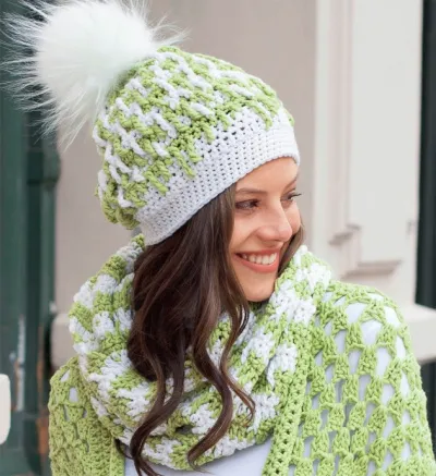 Двухцветный комплект из шапки с помпоном и снуда, связанный крючком рельефным узором, очень практичный и удобный и отлично спасает от холода.