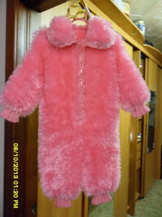 Классные комбезики! Так и хочется погладить эту пушистость! А розовый надо было тоже с капюшоном вязать, для деток это очень удобно — нигде не дует)))