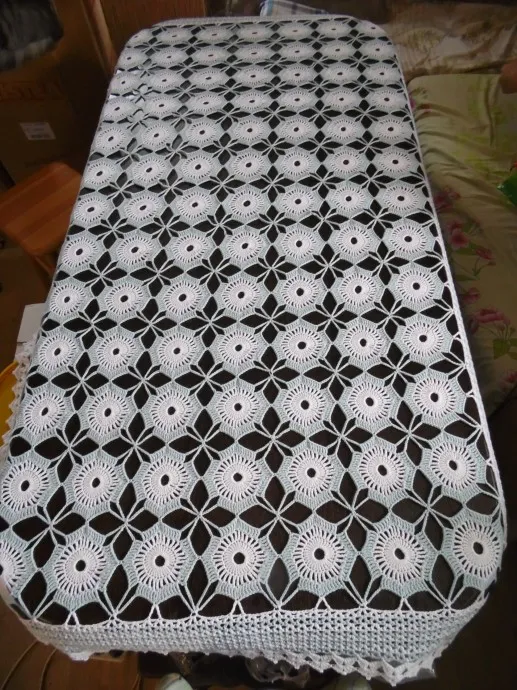 Скатерть связана из ниток х.б простых не мерсеризованных,пошло 350 г. крючок 1.5 размер 90х130 см. вязала для себя.