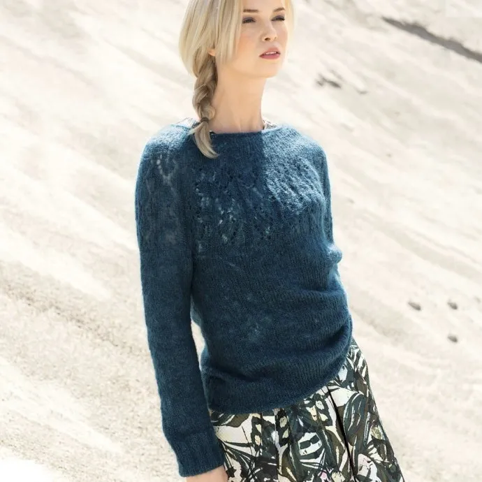 Пряжа (54% мохера, 46% полиамида; 155 м/25 г) — 250 (275) 300 г изумрудной; спицы №3,5 и 4; короткие и длинные круговые спицы №4.