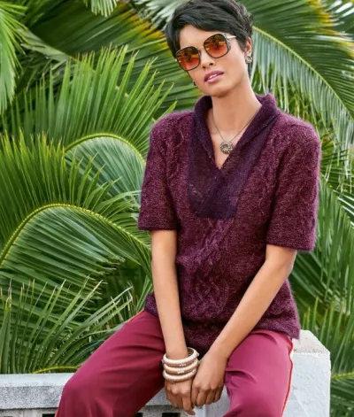 Красивые узоры, женственный силуэт и нежная пряжа делают этот пуловер очень изящным. Впечатление усиливает ряд кристаллов Swarovski, расположенных по краю воротника.