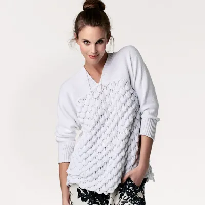 Необычный пуловер с оригинальным объемным узором и «двойным» V-образным вырезом (и впереди, и сзади).