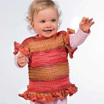 Горловину и разрез на спинке обвязать крючком №3 1 рядом ст. б/н, начиная от левого края разреза. Затем по краю горловины связать еще 3 ряда ст. б/н. В конце из воздушных петель выполнить небольшую петлю для пуговицы. В начальном ряду распустить вспомогательную нить и все петли перевести на круговые спицы №3 = 148 (164—176) 192 п. Отметить начало кругового ряда. Вязать спиралевидную оборку круговыми рядами, через 5 см все петли закрыть.
