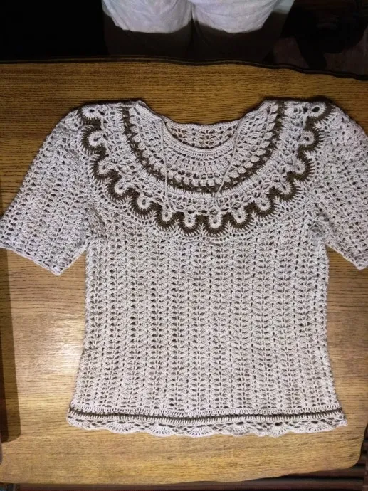 Блузка (топик) вязалась по мотивам туники "Клеопатра"(много разных вариантов схем есть в интернете ). Сто раз начинала и сто раз разбрасывала. Сделала, один раз надела и все... То ли стесняюсь, то ли еще что... То она на спину тянет, то на горло давит))))) Может, к следующему лету будет как раз в пору.