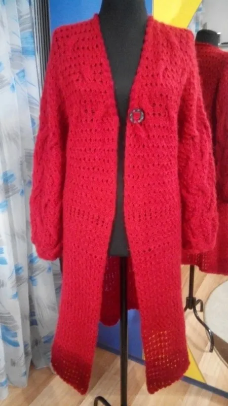 Изначально планировала короткий сделать, но потом решила удлинить. Вязала вниз по кругу,от талии, делая равномерно прибавки на расширение. Перед сделала со скосом, длиннее спинки.