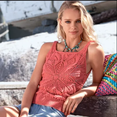 Перед и спинку вязать круговыми рядами от середины, они состоят из круглого мотива с ажурным узором, стрелки на схеме выкройки показывают направление вязания. Бретели и планку вязать непосредственно от основной детали.