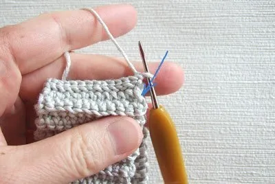 1 петля подъема и затем ввожу крючок в петлю под стрелкой (она между ребер - в впадине) - провязываю в ней 1 СБН