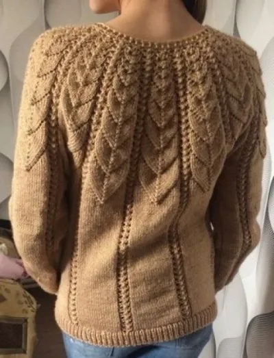 Нитка Лана Голд 800 метров, вязала в две нитки, спицы№ 2 Вязался свитер очень легко. Вязала в две нитки. Ушло три мотка По кругу набрала 144 петли получилось 18 листиков по 5 на перед и спинку и по 4 на рукава.