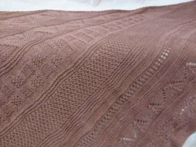 А, самое интересное же! По углам 2 м 40 см, самая длинная часть 2 м 80 см. Гигантиш однако :))))) Вязалось недолго, максимум недели две. Спицы крупные, нитки тоже не самые тонкие. Плюс очень «вштырило», да и даты поджимали. Признаю: много раз посещали крамольные мысли оставить себе сей «шедевр», но цвет не мой. Так что обязательно к весне соображу себе любимой, но уже с другими узорами и ниточками.