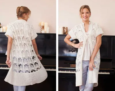 Пряжа (70% хлопка, 24% полиамида, 6% полиэстера; 110 м/50 г) – 550 (650) 750 г белой; крючок № 5; круговые спицы № 5; белая застежка-булавка.