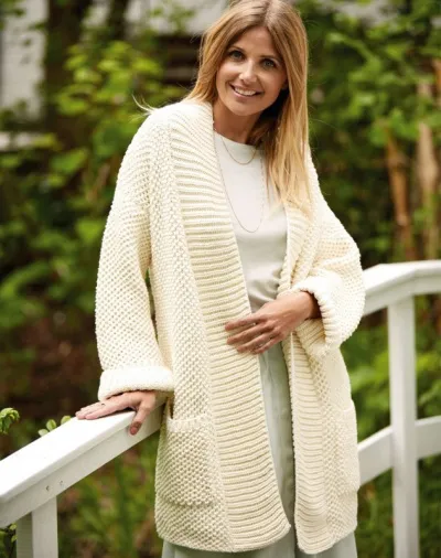 На левой полочке петли набрать так же, закончить у наборного ряда (количество петель должно быть четным). Вязать патентной резинкой. Через 14 см петли плотно закрыть в лиц. ряду по рисунку. К полочкам пришить карманы, как на фото.