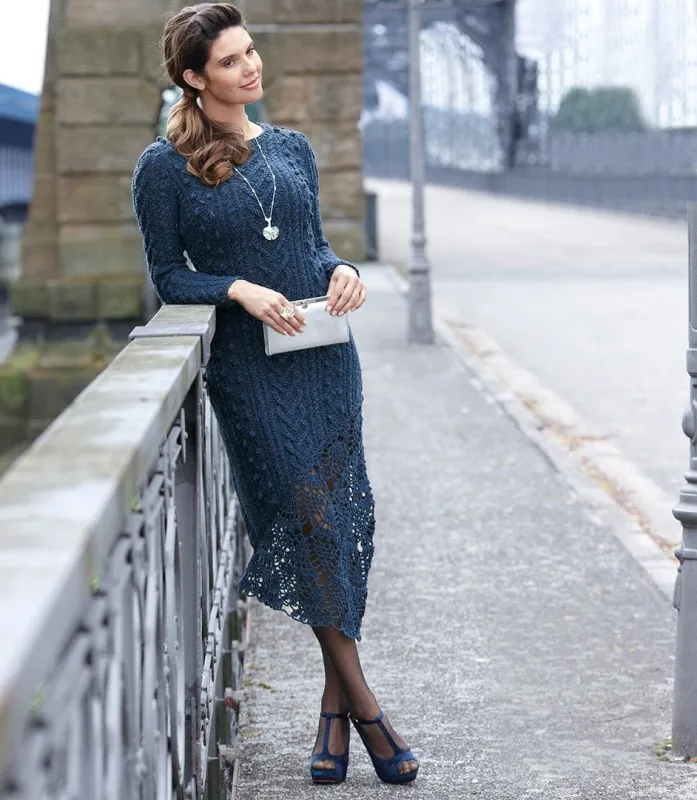 Само платье связано на спицах, а полупрозрачная ажурная вставка по низу – крючком. Эта чудесная модель просто создана для романтических моментов в жизни!