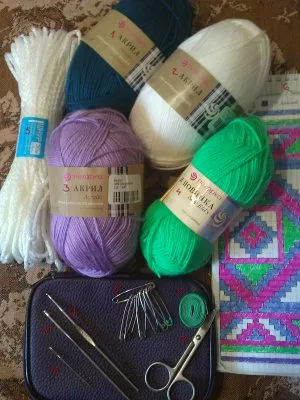 1) Пряжа акрил 100% 100 г /300 м " Пехорка. Классическая" цвет Морской волны (14, лот 963) — 2 шт. Основной цвет: используется для вязания дополнительного укрепленного донышка, кармашков, в самой сумке и т.д.