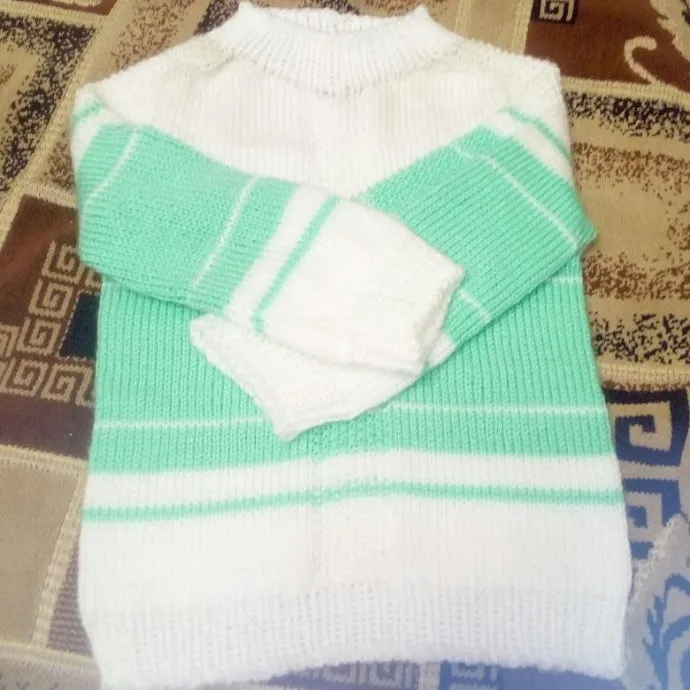 Не дурно решили с горловиной. И всё же надо было чуть меньше петель на горловину брать. Мне очень нравится обработка вещи, вывязан росток, резинка как машиной вывязана. На руковах закрыли резинку иголкой. Погон вывязан замечательно, только вам надо поработать над плавным завершением проймы. Здесь вещь на ребёнка — прокатило, но взрослая вещь вам этого не простит. Успехов!
