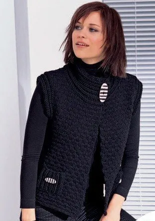 Чёрный жилет из несложных рельефных узоров, с накладными карманами и декоративными пуговицами «под зебру» очень быстро вяжется на толстых спицах.