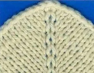 Разделяющая полоса между прибавляемыми петлями вправо и влево может состоять из изнаночной петли (рис. 1), содержать несколько изнаночных петель и быть дополнена (украшена) узором (рис. 2) или состоять из лицевых петель . Перед лицевой петлей следует выполнять воздушную петлю елевым поворотом, а после лицевой петли — воздушную с правым поворотом. Поэтому при вязании рукавов для образования боковых скосов после кромочной следует прибавлять петли с правым поворотом, а перед кромочной — с левым.