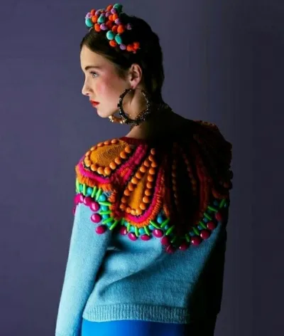 Очень этническая работа, встретила эти фото в одной из соцсетей как пример современных вязаных вещей. Смотрю на сочетание пластиковых кабошонов, ярких бусин, нарочито небрежной вышивки и вязаного полотна и прямо теряюсь...определенно мне такое такое нравится, носила бы я? Вопрос.