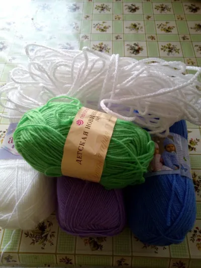 Пряжа Alize bebe Sekerim. Производство Турция. Полиакрил 100 %. В 100 гр - 320 м. Зеленая пряжа Пехорка "Детская новинка" в 50 гр - 200 м. Крючки - 2; 1,7