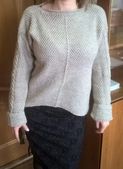 батюшки, что ж тут описывать? Всё и так видно-жемчужинка (меняешь в каждом 3-м ряду,1-ряд 1лиц.,1изн. 2-ряд по рисунку.3-ряд-над лицевыми-изнаночные, над изнаночными лицевые. Ну… это если, вдруг, не знаешь)) да косы в разные стороны с изнаночной петлей между ними, вытянутая петля посередине. Вероятно два квадрата, да рукава с прибавками в каждом 4 или 6-м ряду. Да вырез «лодочкой», плечи сшиваешь, горловину оставляешь, сколько нравится, вывязывать её, судя по всему, не надо